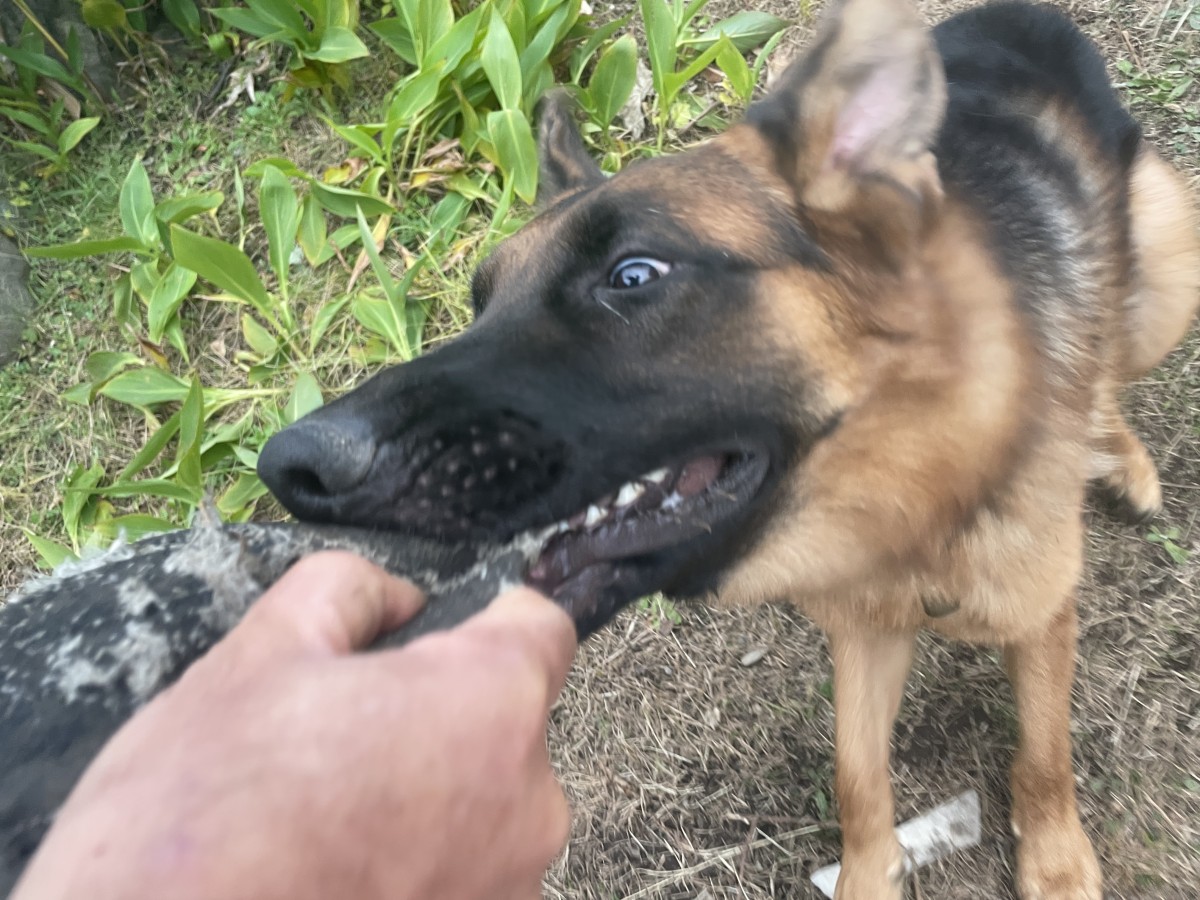 なんだか素敵な物語にでもなりそうなシチュエーションですが、現実はそんなハートウォーミングではありません。シェパードの子犬はエネルギーの塊です。彼はコミュニケーションとして噛むは飛びつくわ、押し倒すわ、収拾がつきません。