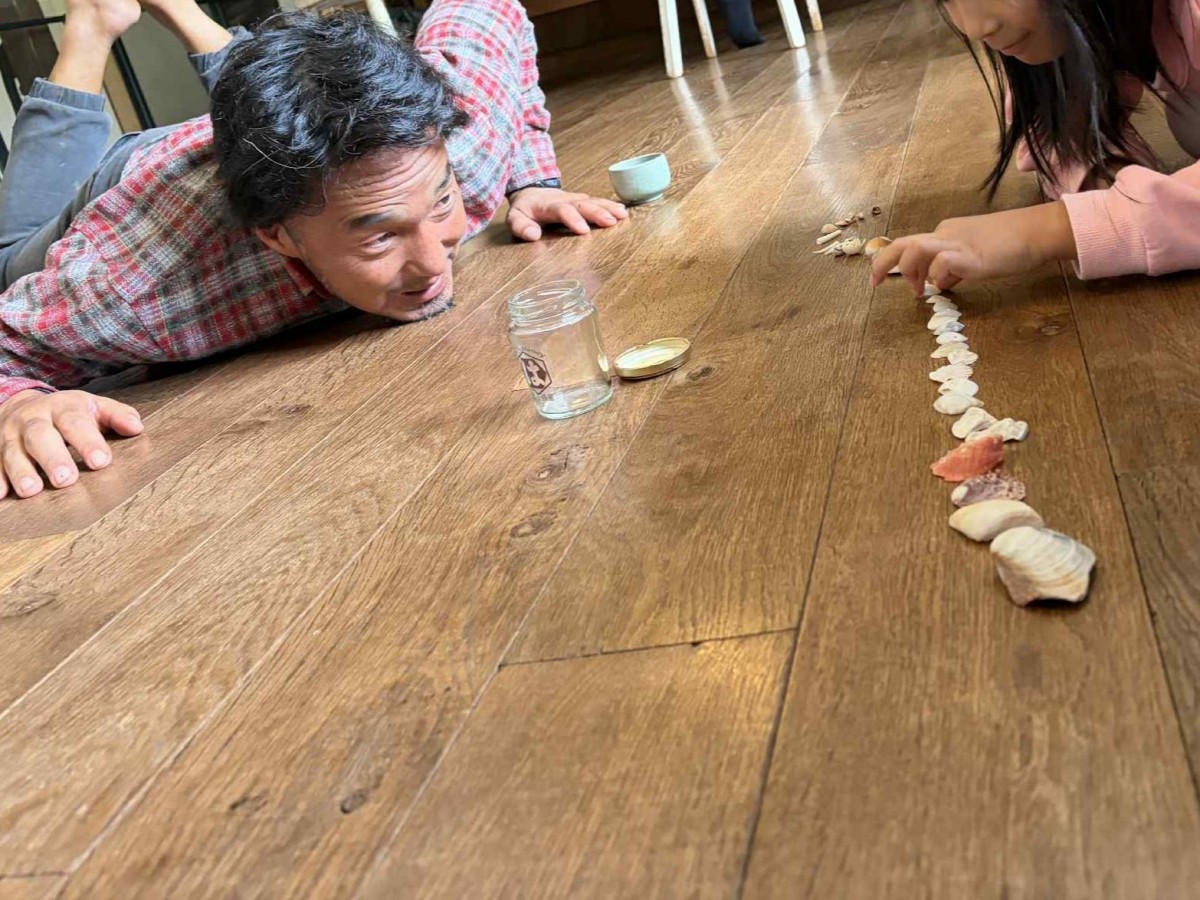 ランチが終わって、我が家にきて、海岸で彼女が集めた貝殻を床に並べ始めました。ちょっとだけ、場にも慣れてきたのでしょう。ワタクシは遊ぶことを10年以上、生業にしてきた人間。そういうふとした緩んだ瞬間を見逃してはならんのです。